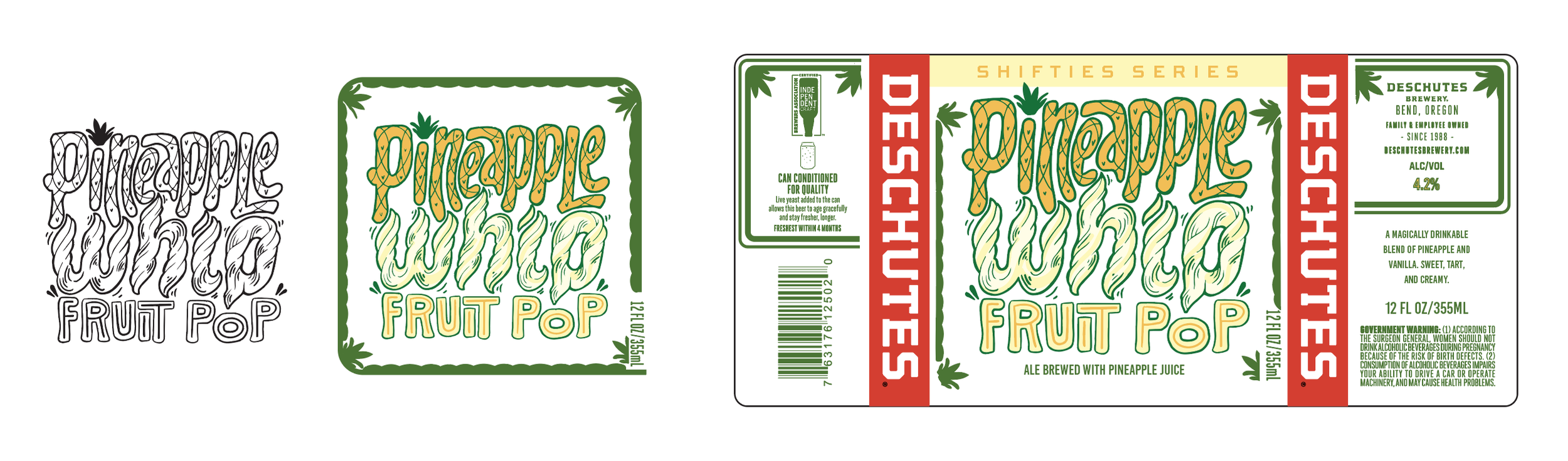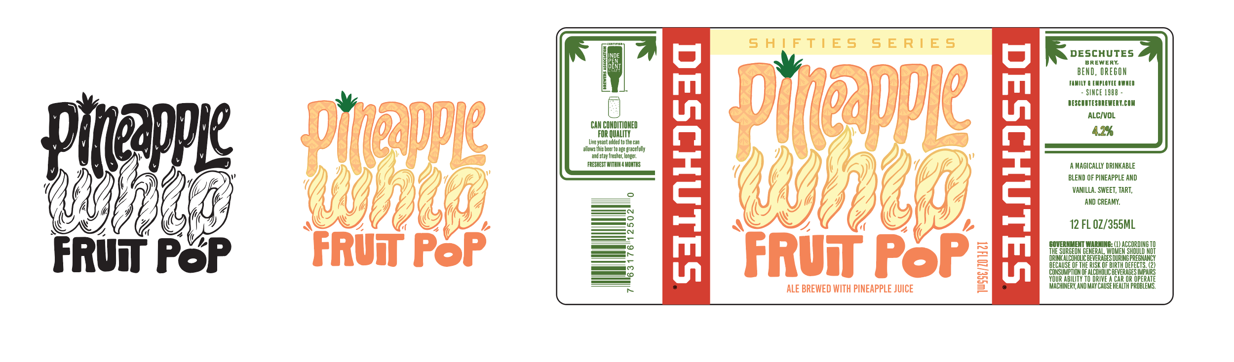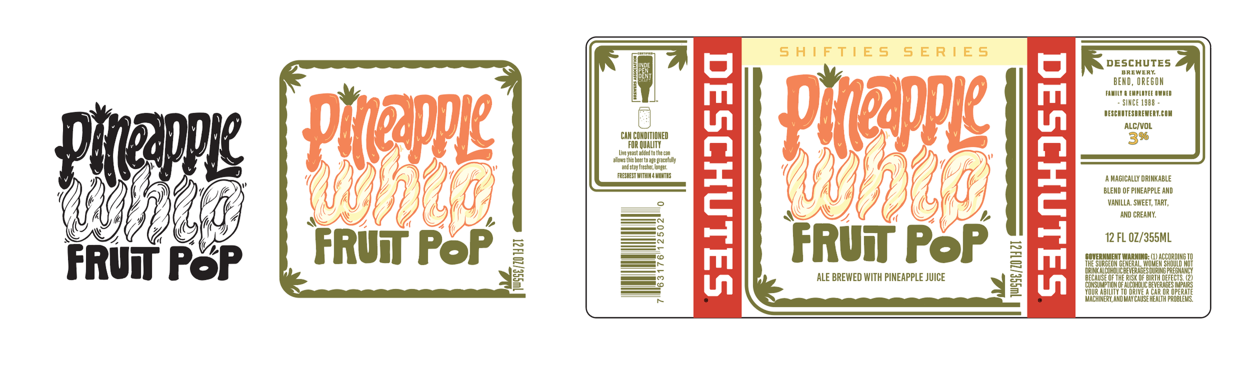 An ale brewed with pineapple juice and vanilla flavors, Pineapple Whip Fruit Pop called for a design as playful and nostalgic as its name. Leaning into an illustrative type approach, the label was inspired by the bold, cheerful energy of 1950’s advertisements—where hand-drawn typography and whimsical layouts invited consumers in.